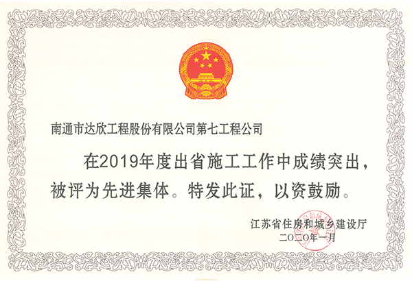 江蘇省住房和城鄉(xiāng)建設(shè)廳公布了“2019年度江蘇出省施工企業(yè)先進(jìn)集體和先進(jìn)個(gè)人的通報(bào)”。第七工程公司榮獲“2019年度江蘇出省施工企業(yè)先進(jìn)集體”,陳貴榮同志被評(píng)為“江蘇出省施工先進(jìn)個(gè)人”。