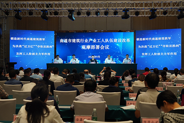 9月17日上午,南通市建筑行業(yè)產(chǎn)業(yè)工人隊(duì)伍建設(shè)改革觀摩部署會(huì)在達(dá)欣集團(tuán)舉行。南通市總工會(huì)黨組書(shū)記、副主席、產(chǎn)業(yè)工人隊(duì)伍建設(shè)改革聯(lián)席會(huì)議辦公室主任葛志娟,南通市住房和城鄉(xiāng)建設(shè)局黨組副書(shū)記、副局長(zhǎng)、一級(jí)調(diào)研員沈衛(wèi)星,南通市總工會(huì)四級(jí)調(diào)研員楊紅衛(wèi);各(縣)市、區(qū)總工會(huì)領(lǐng)導(dǎo)、勞動(dòng)和經(jīng)濟(jì)工作部部長(zhǎng),以及南通市建筑施工特級(jí)資質(zhì)企業(yè)、海安市建筑施工一級(jí)資質(zhì)企業(yè)負(fù)責(zé)產(chǎn)改的主要領(lǐng)導(dǎo)等120多人參加觀摩會(huì)。海安市委常委、組織部部長(zhǎng)、統(tǒng)戰(zhàn)部部長(zhǎng)張明星,海安市政協(xié)副主席、總工會(huì)主席李如生;海安市總工會(huì)黨組書(shū)記、副主席柴寶清,海安市建管局局長(zhǎng)賈伯根等陪同參加;集團(tuán)董事長(zhǎng)馬和軍,黨委書(shū)記劉厚純,副總經(jīng)理、工會(huì)主席溫鶴華參加活動(dòng)。