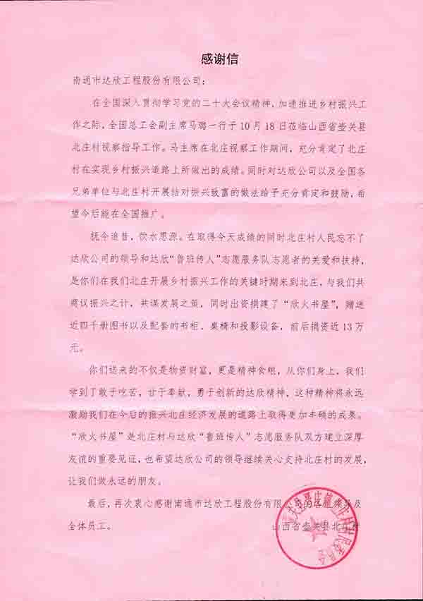 元月9日,公司收到來自山西省壺關縣北莊村村委會黨支部寄來的錦旗和感謝信,對集團在助力北莊村鄉(xiāng)村建設、鄉(xiāng)村振興、鄉(xiāng)村致富等方面所給予的關愛和扶持表示感謝。