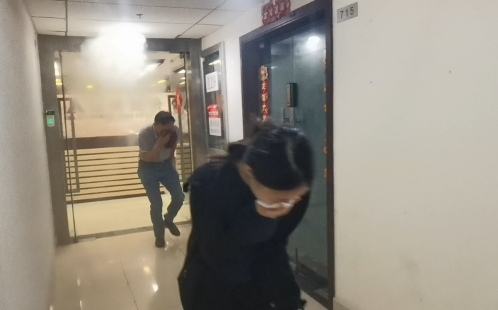 現(xiàn)場(chǎng)從發(fā)現(xiàn)著火點(diǎn)、報(bào)警、疏散人員等情景開展模擬演練。隨著火警警報(bào)的響起,在場(chǎng)人員立即按照預(yù)先制定的疏散方案行動(dòng)。大家迅速采取“彎腰低頭、捂鼻貼墻”的逃生姿勢(shì),在疏散過程中,大家保持冷靜,有序地沿著疏散通道向室外撤離。
