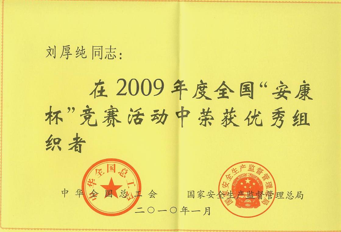 中華全國總工會(huì)、國家安全生產(chǎn)監(jiān)督管理總局聯(lián)合發(fā)文,公司黨委書記、副董事長(zhǎng)劉厚純獲得2009年度全國“安康杯”競(jìng)賽活動(dòng)優(yōu)秀組織者稱號(hào)。