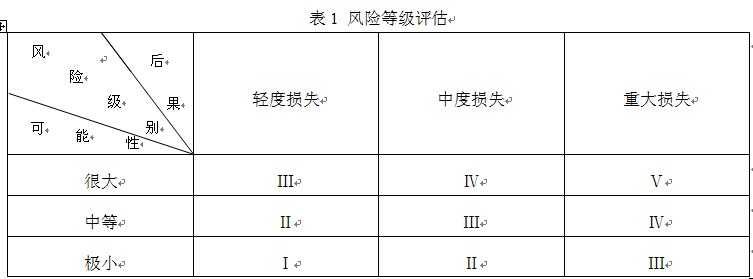 在對危險源識別的基礎(chǔ)上,評估危險源造成風險可能性和大小,對風險進行分級,對不同等級風險采用相應的風險控制措施。風險等級評估:Ⅰ級為可忽略風險;Ⅱ級為可接受風險;Ⅲ級為中度風險;Ⅳ級為重大風險;Ⅴ級為不容許風險,如表1。