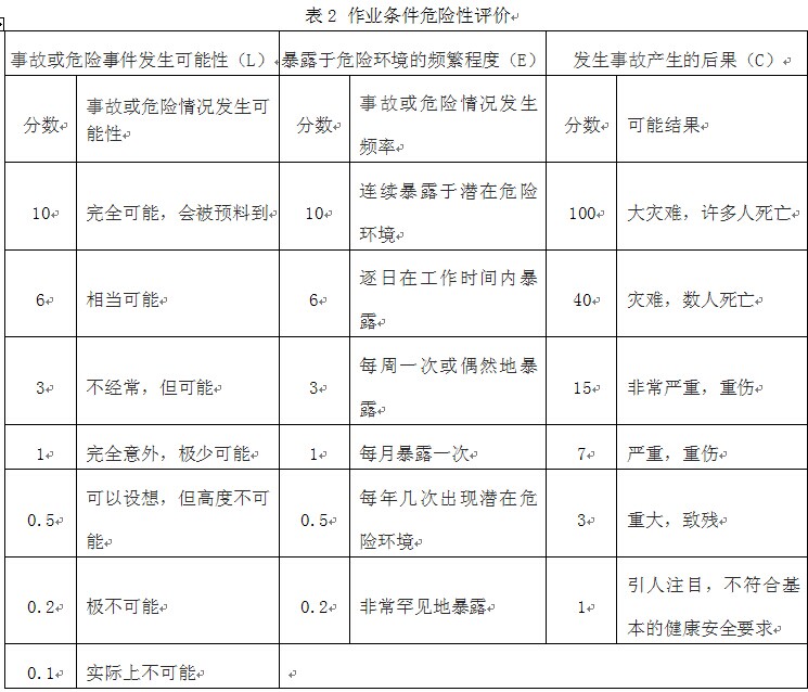 表2 作業(yè)條件危險性評價