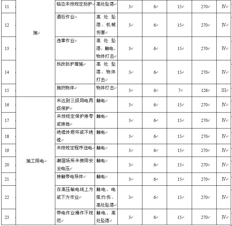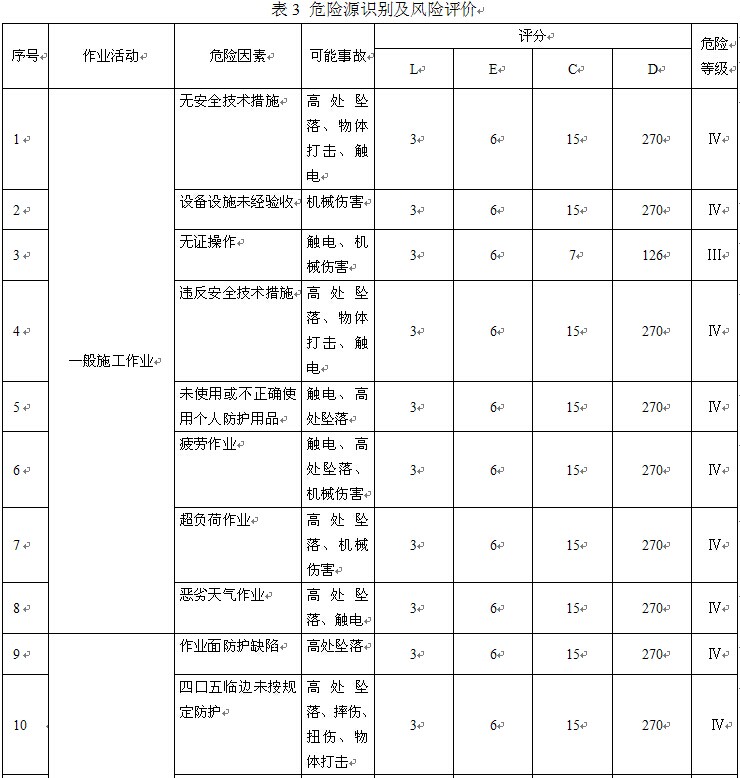 本公司目前在建的主要工程有:重慶直升機投資有限公司項目(包括總裝廠房、交付中心和教學大樓),重慶機床集團搬遷項目(包括廠房、科技大樓、倒班宿舍)。公司針對兩個施工現(xiàn)場特點進行分析,制訂了危險源識別及風險評價表,部分內(nèi)容如表3。