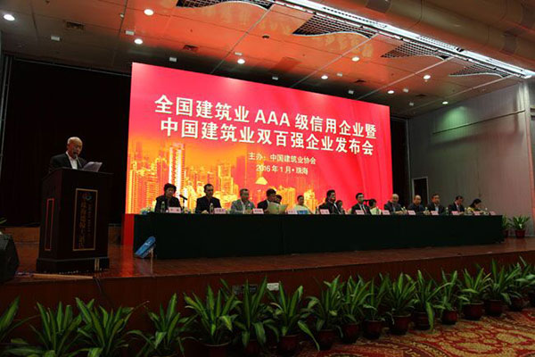 2016年1月7日,為展示全國(guó)建筑業(yè)AAA級(jí)信用企業(yè)和中國(guó)建筑業(yè)雙百強(qiáng)企業(yè)品牌形象,弘揚(yáng)誠(chéng)信經(jīng)營(yíng)、追求卓越的行業(yè)風(fēng)氣,中國(guó)建筑業(yè)協(xié)會(huì)在珠海召開2015年度全國(guó)建筑業(yè)AAA級(jí)信用企業(yè)暨2014年度中國(guó)建筑業(yè)雙百強(qiáng)企業(yè)發(fā)布會(huì)。中國(guó)建筑業(yè)協(xié)會(huì)會(huì)長(zhǎng)王鐵宏、副會(huì)長(zhǎng)兼秘書長(zhǎng)吳濤出席會(huì)議,副秘書長(zhǎng)李蓬主持會(huì)議。廣東省住房城鄉(xiāng)建設(shè)廳黨組副書記、巡視員陳英松致歡迎辭,各地區(qū)和有關(guān)行業(yè)建設(shè)協(xié)會(huì)和企業(yè)代表等共400余人參會(huì)。